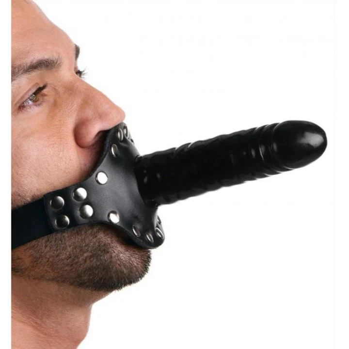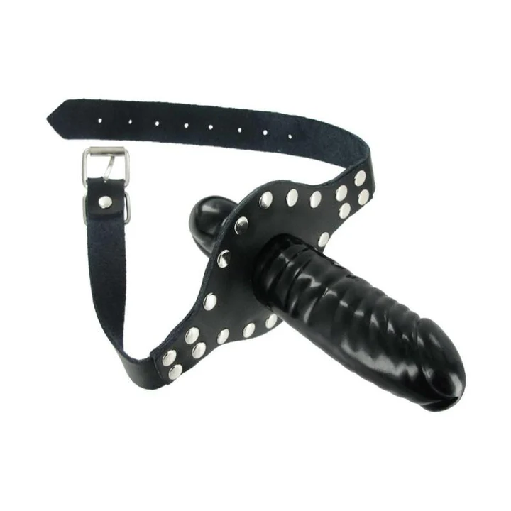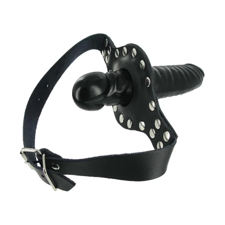 The Ride Me Mouth Gag keeps you stuffed and your partner silent! There is plenty of penetration to go around with a glossy black dildo on the outside, and a cock-shaped mouth gag on the inside. This double dose of dick is supported by a heavy-duty adjustable leather strap that buckles behind the head, and a studded mouth-guard. Fill up their mouth and then climb on and ride!